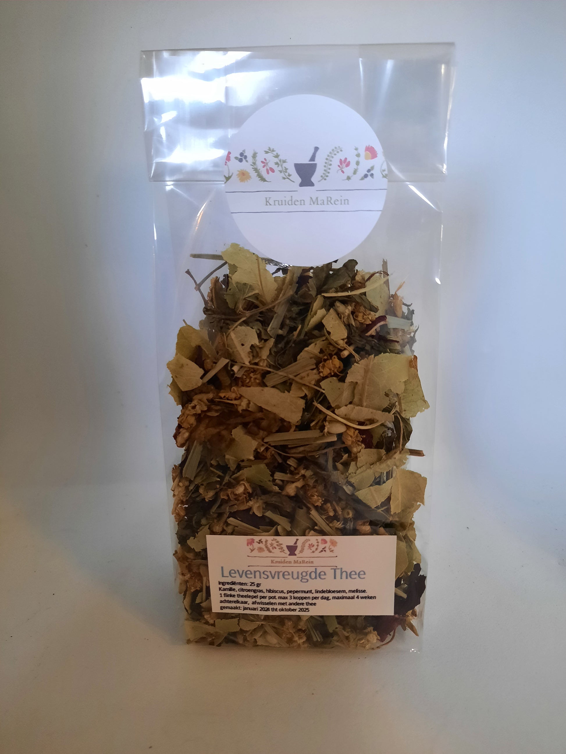 Kamille, Melisse, Lindebloesem, Pepermunt, Hibiscus en Citroengras.