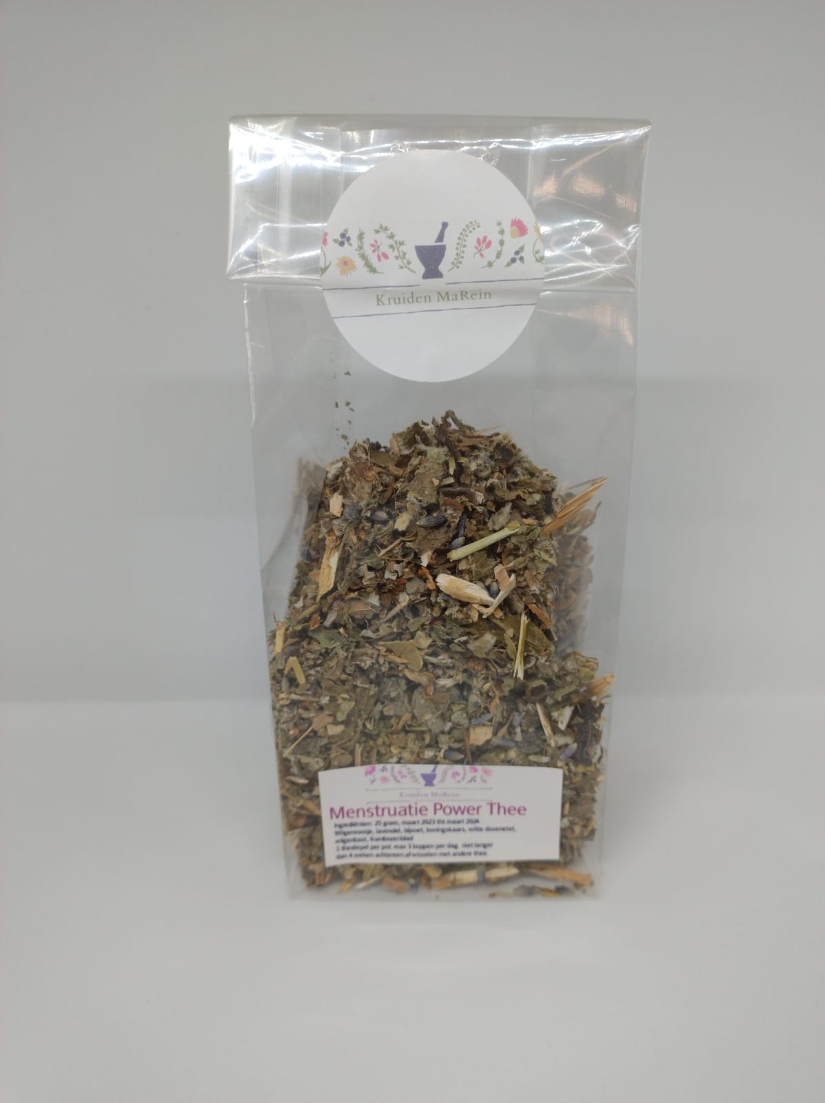Ingrediënten: Lavendel, bijvoet, koningskaars, frambozenblad, wilgenbast, witte dovenetel