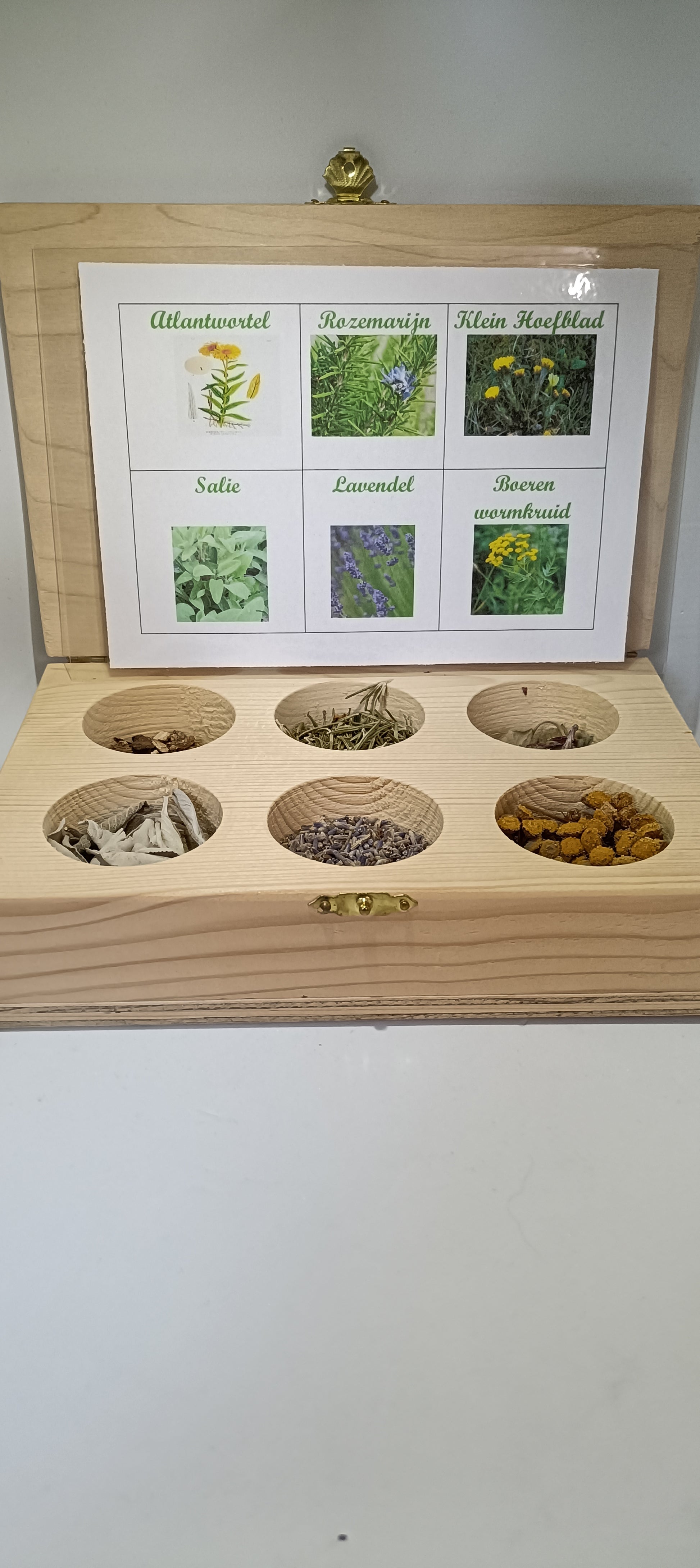 Ingrediënten: een handgemaakt houten kistje met 6 soorten gedroogde kruiden. Geschikt om te roken op een brandertje voor heerlijke geur sensaties.
