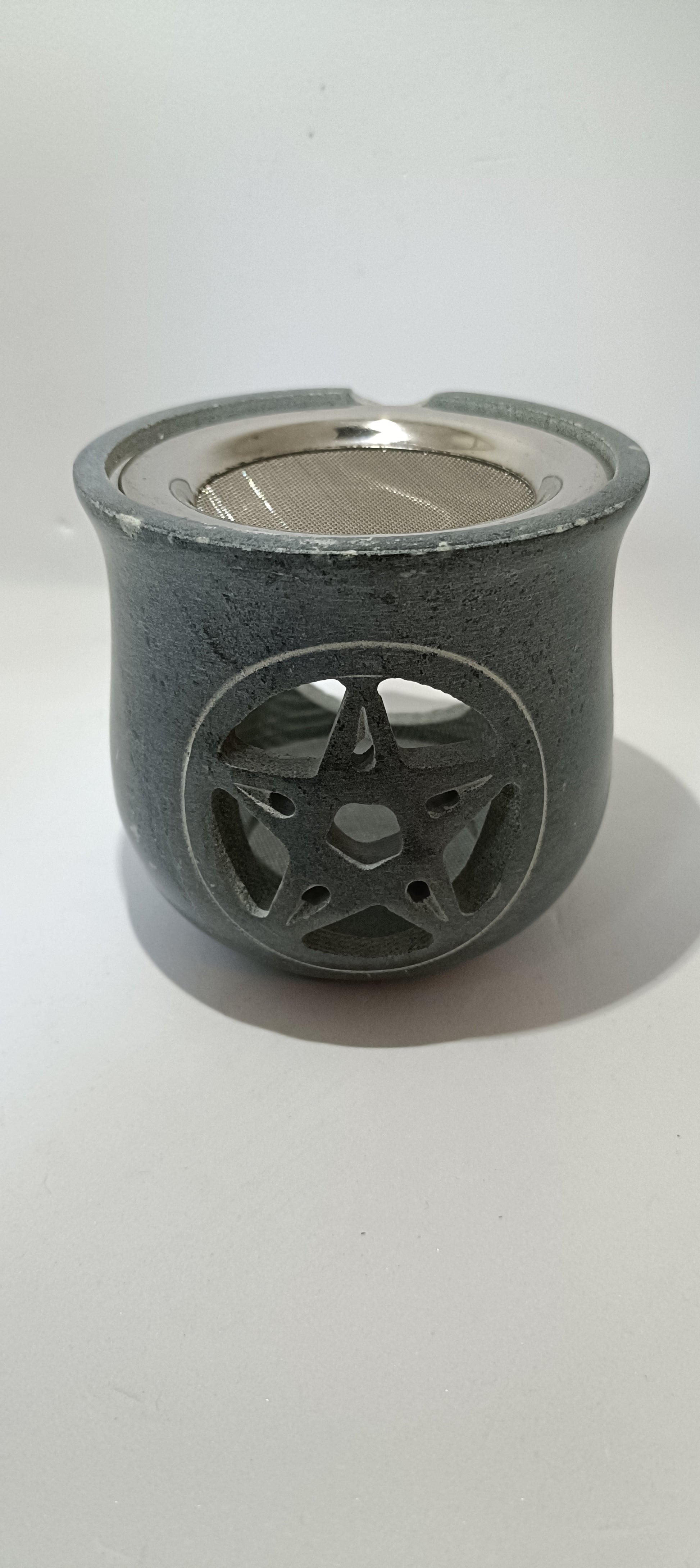 Een stenen potje met een aluminium roostertje.