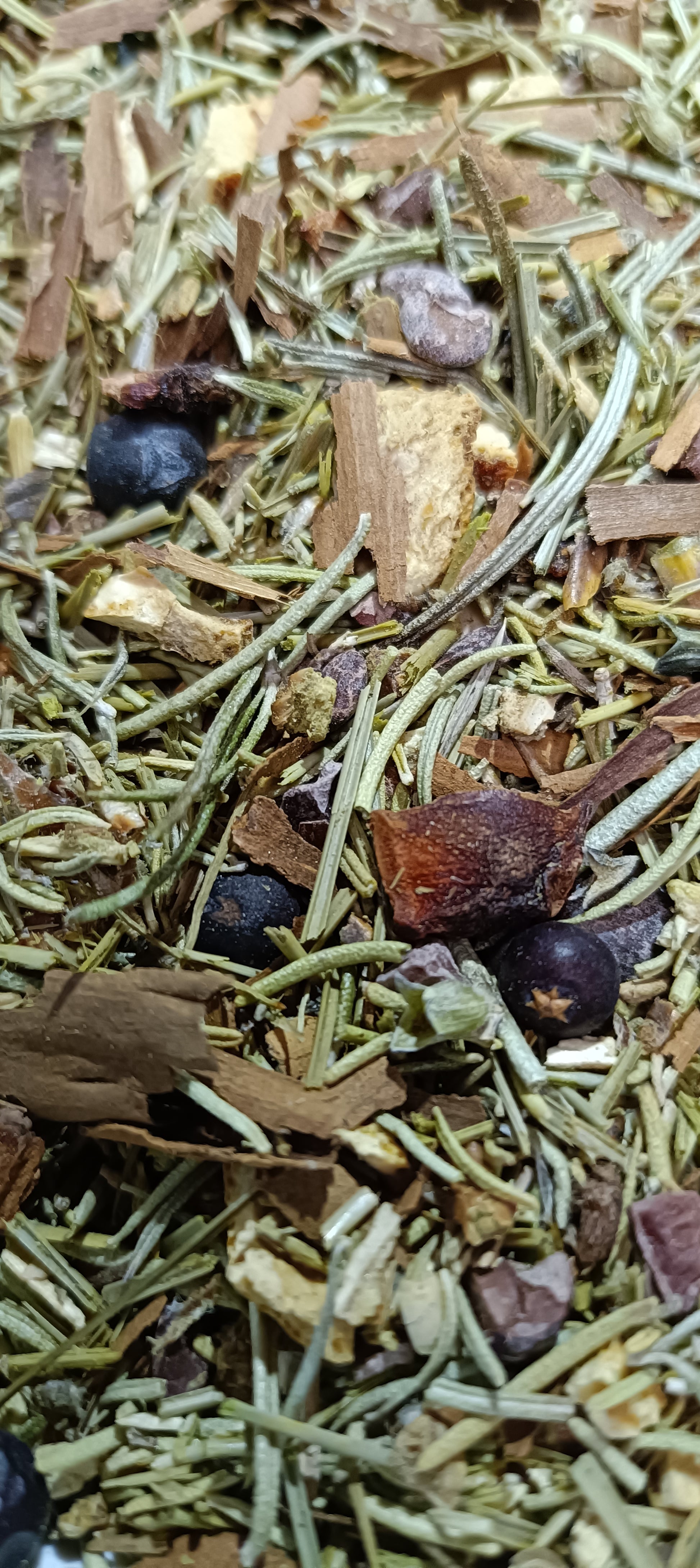 Ingrediënten: dennennaalden, sparrentoppen, cacaonibs, sinaasappelschil, jeneverbes, kaneel, rozemarijn, steranijs.